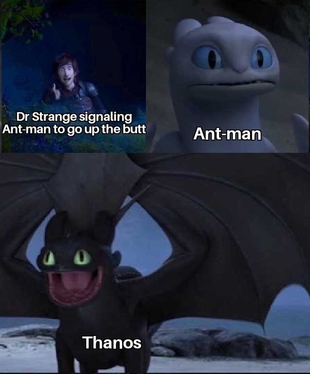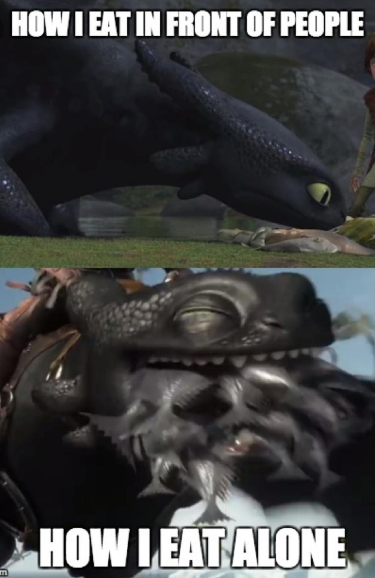Toothless face meme. Online a three-panel image based on the scene has been used as an exploitable for object-labeling memes. The visual content of this image is harassing me. The textual content of this image is harassing me or someone I know.